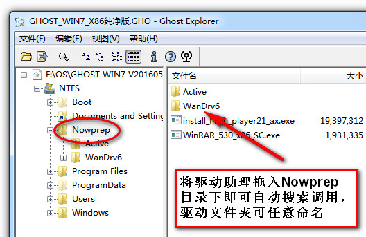 1、如需要加入驱动助理,可打开GHO文件,找到Nowprep文件夹,将驱动助理拖入即可实现自动调用
